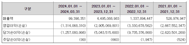 2023년에는 449원으로 매출액은 증가하였으나, 영업이익 손실은 290억원, '24년도는 130억원으로 여전히 손실 상태입니다.
