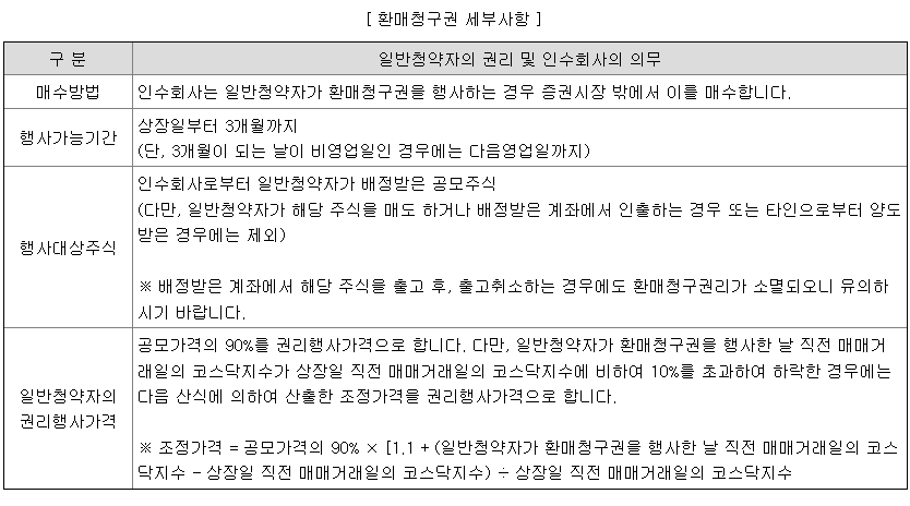 환매청구권: 공모주 가격이 내려가면서 증권사가 90% 가격으로 환불해주는 제도입니다. 환매청구권 세부사항은 아래와 같습니다.