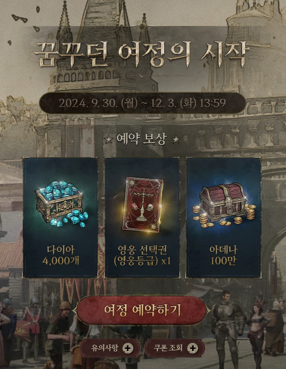 다이아 4,000개, 영웅 선택권(영웅등급) 1개, 아데나 100만의 사전예약 보상은 기간 안에 사전예약을 해야만 받을 수 있습니다. 간단하게 휴대폰 인증을 통해 사전예약을 할 수 있습니다.