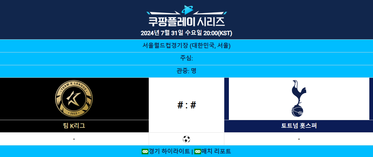 2022년에 이어 2024년 6월 5일, 한국프로축구연맹과 쿠팡플레이가 쿠팡플레이 시리즈의 일환으로 팀 K리그와 잉글랜드 프리미어 리그(EPL) 토트넘의 경기를 개최했다는 소식이 전해졌습니다. 토트넘은 이번 한국방문 일정에 두 경기를 소화할 예정인데, 우선 7월 31일로 예정된 K리그 올스타전에서 팀 K리그와 친선전을 치르고 난 후 8월 3일 FC 바이에른 뮌헨과 맞대결을 벌일 예정입니다.
