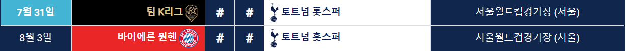 경기는 24년 7월 31일(수) 팀K리그 : 토트넘 홋스퍼의 경기 이후, 24년 8월 3일(토) 20:00시 에는 김민재 선수가 뛰고 있는 바이에른 뮌헨과 손흥민 선수가 활약하고 있는 토트넘 홋스퍼의 경기가 서울 월드컵경기장에서 이뤄질 예정입니다.