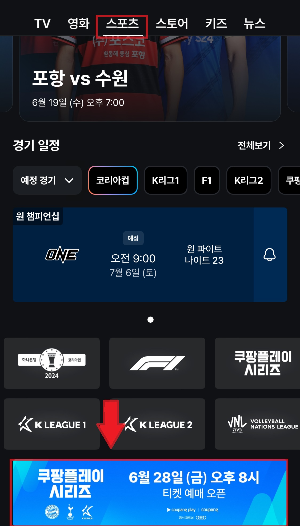 - 쿠팡 플레이에 접속하여 로그인하고 상단의 ‘스포츠’ 탭을 클릭합니다.